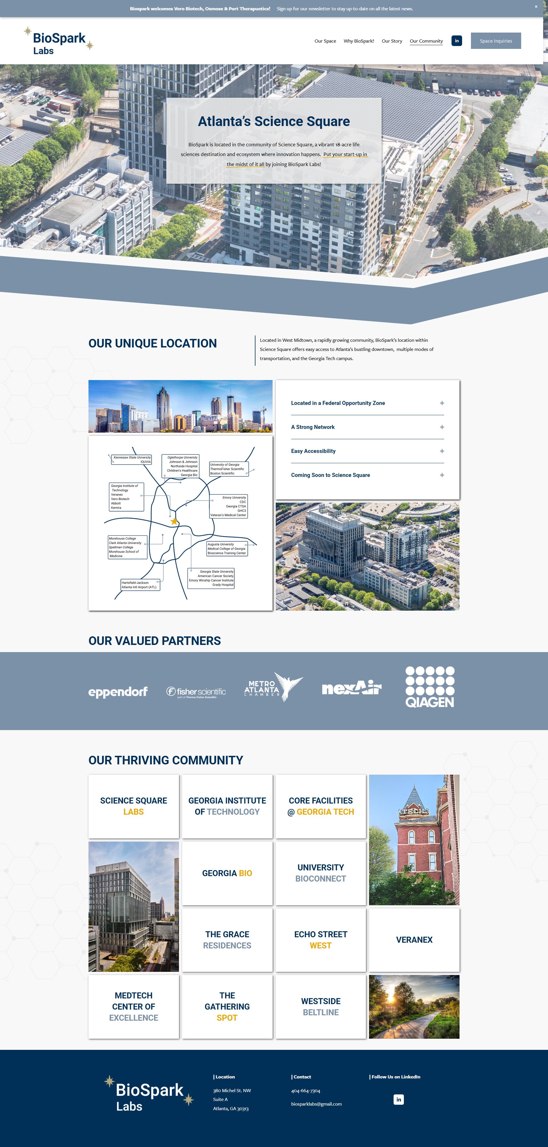 The goal for the BioSpark Labs website redesign was to create a site that was more representative of their modern space. Additionally, we focused on restructuring the old website, clearly highlighting their top selling points: their space, amenities, and community.